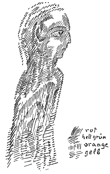 Aber eigentlich ist der Mensch ja auf der Erde nur in bezug auf seine sinnliche Wahrnehmung und in bezug auf alles das, was Verstandeserkenntnis ist, denn das hängt mit dem sinnlich-physischen Leib zusammen. — In Wahrheit ist die Sache so: Wenn wir uns den Menschen vorstellen (Zeichnung Seite 228), so ist er nur in bezug auf seine Sinne und auf seine Verstandeserkenntnis herausragend über die Hierarchien, die über ihm wohnen - ich müßte also das Rote über den Wärmesinn und alles führen (rot) —, während er mit Bezug auf alles, was hinter seinem Verstande liegt, ausgefüllt ist mit der dritten Hierarchie (hellgrün). Mit Bezug auf alles, was hinter seinem Fühlen liegt, ist er ausgefüllt mit der zweiten Hierarchie (Brust, orange), für alles das, was hinter seinem Wollen ist, mit der ersten Hierarchie (Rumpf, gelb).