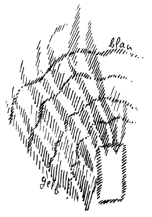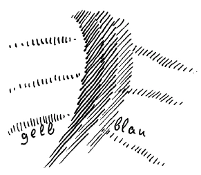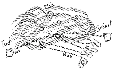 Nun wird es sich uns aber heute viel mehr darum handeln, wie dieser Instinkt sich vorbereitet, wenn der Mensch durch die Pforte des Todes geht. Hier im Erdenleben ist das karmische Erleben eben instinktiv, es spielt sich sozusagen unter der Oberfläche des Bewußtseins ab. In dem Augenblicke, wo wir durch die Pforte des Todes gegangen sind, wird alles das, was wir zunächst auf Erden erlebt haben, während weniger Tage ja objektiv bewußt; wir haben es vor uns in sich immer vergrößernden Bildern. Da geht mit dem, was wir da überschauen, auch dasjenige mit, was sich instinktiv im karmischen Walten abgespielt hat. So daß also, wenn der Mensch durch die Pforte des Todes schreitet und das Leben, sich immer mehr vergrößernd (siehe Zeichnung, gelb) vor seinem Anblick sich abspielt, mit alledem auch dasjenige mitgeht, was ihm nur instinktiv, nicht bewußt war: das ganze karmische Gewebe (blau). Das sieht er nicht gleich in den nächsten Tagen nach dem Tode, aber er sieht allerdings das, was er sonst nur in der blassen Erinnerung überblickt, in lebendiger Gestaltung; er sieht zum Beispiel, daß da schon etwas anderes drinnen ist als die gewöhnliche Erinnerung. Wenn man dann mit dem Initiationsblick überschaut, was da der Mensch vor sich hat, so kann man folgendes ausführen.