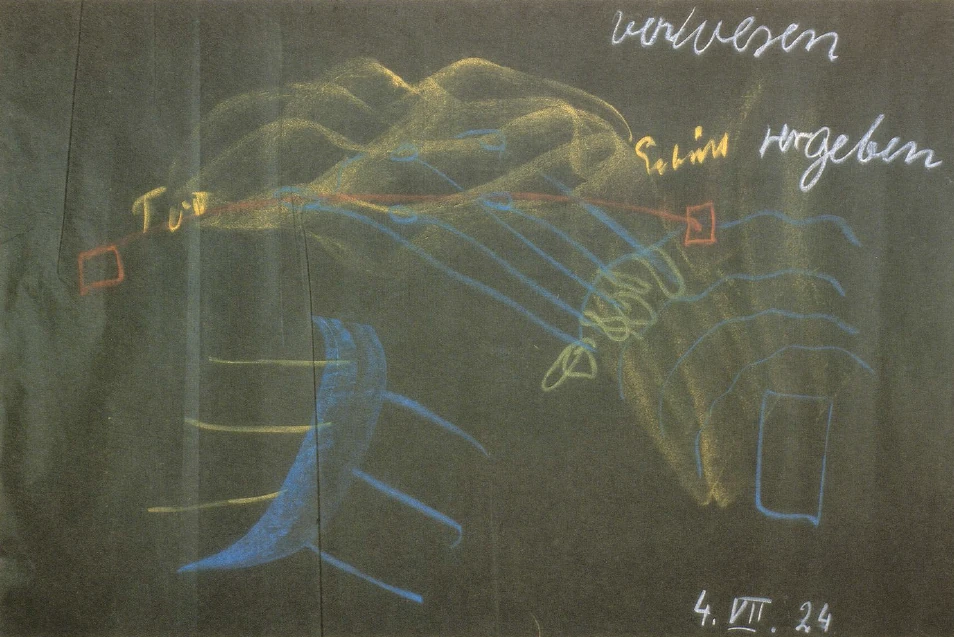 Now, however, we will be much more concerned today with how this instinct prepares itself when the human being passes through the gate of death. Here in earthly life the karmic experience is instinctive, it takes place, so to speak, beneath the surface of consciousness. At the moment when we have passed through the gate of death, everything that we initially experienced on earth becomes objectively conscious for a few days; we have it before us in ever-increasing images. What we see there is also accompanied by what has instinctively taken place in the karmic workings. So that when the human being passes through the gate of death and life, enlarging more and more (see drawing, yellow), plays itself out before his eyes, that which he was only instinctively, not consciously aware of, also goes with it: the whole karmic fabric (blue). He does not see this immediately in the next few days after death, but he does see what he otherwise only sees in the pale memory in a living form; he sees, for example, that there is already something else in there than the usual memory. If one then looks with the initiatory gaze at what the human being has before him, the following can be explained.