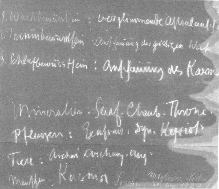 Dieser dritte Bewußtseinszustand der Menschen, die unmittelbar auf die atlantische Katastrophe folgten, war die Anschauung des Karma. Die war ihnen eben in dieser Zeit einfach eine Realität. (Fortsetzung der Tafelanschrift:)