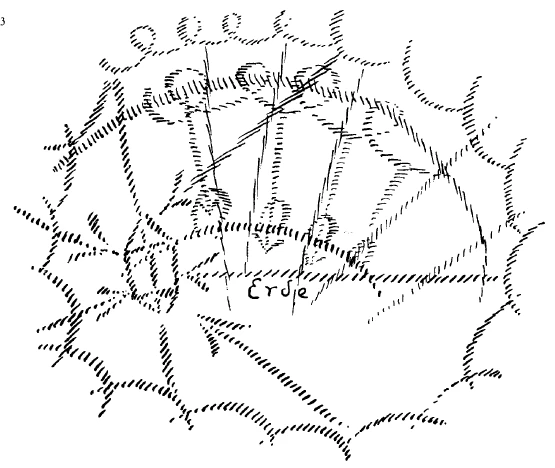 We have to see through the earth. That means it is not there. We have to keep looking because it is not there. And for the minerals we are now compelled not only to look at what is above us, but to look at the whole surrounding area. The earth must be as if erased. We must look below the same as above, westwards the same as eastwards (see drawing p. 52).
