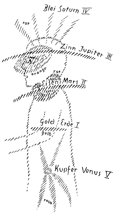 Noch weiter im Weltenall draußen lebt das Zinnbewußtsein (Zeichnung: orange). Es ist gar nicht wahr, daß Sie allein hier auf Erden leben. Sie leben auf Erden dadurch, daß Sie ein Herz haben. Das hält Ihnen das Bewußtsein auf der Erde zusammen. Dasjenige, was im Kehlkopf sitzt (Eisen: rot), das lebt draußen im Weltenall. Und noch weiter draußen lebt dasjenige, was über den Augen im Kopfe sitzt (Zinn). Eisen reicht hinauf bis zum Mars. Das Zinn reicht hinauf bis zum Jupiter. Durch das Gold nur sind Sie auf Erden. Sie sind immer im Weltenall; nur das Herzbewußtsein deckt Ihnen das zu.