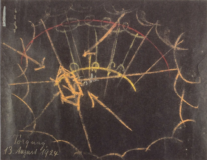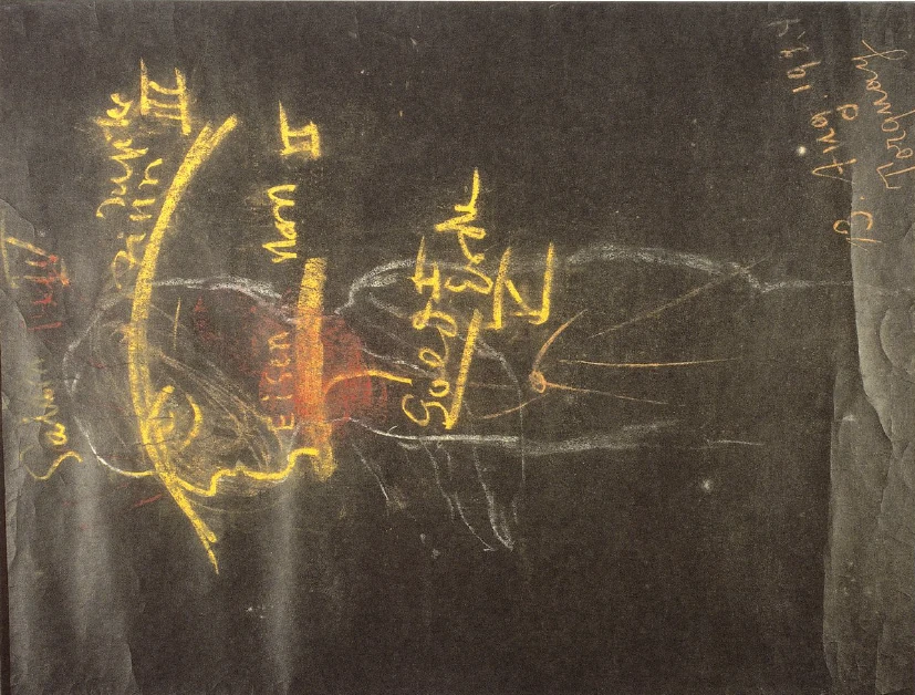 But as this works down (arrows from above), it is not reflected on the earth or through the earth. You see, that is the essential thing. When we rise up from the mineral into the cosmos and look back to the earth, then the earth is no longer a mirror for the mineral. It is as if the earth were not there at all. It escapes our gaze. We cannot say what we can say about the plant: The earth is down there, reflecting. - No, it does not reflect, it behaves as if it were not there at all. When we have concentrated on such a gaze, which emanates from the crystallized mineral, when we have turned our gaze out into the vastness of the world and look back again, then there is a frightening, initially frightening, terrible abyss beneath us, a nothingness. We have to wait. But we must have presence of mind; the wait must not be long. If we wait too long, then the fear becomes enormous because we feel that we have lost the ground beneath our feet. This is a very unfamiliar feeling that manifests itself as a huge fear if we don't have presence of mind and actively penetrate this nothingness.