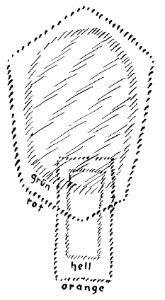 So kann man also [zur Tafel gewendet] sagen: Der Mensch trägt in sich seinen physischen Leib, er ist sinnlich wahrnehmbar. Der Mensch trägt in sich seinen Ätherleib (orange); er ist imaginativ wahrnehmbar, er ist wahrnehmbar durch die Kräfte, die wir uns in der geschilderten Weise durch die Meditation, durch die Konzentration erwerben können. Aber wenn wir mit all diesen Kräften an den Menschen herantreten, nehmen wir von seinem astralischen Leib nur wahr die Leere, ein räumliches Nichts, wie ein Loch, ein allseitig geschlossenes Loch, das in den Raum hineingestellt ist (grün). Erst dann, wenn man, wie ich es geschildert habe, zum leeren wachenden Bewußtsein kommt, wenn man also sich in völlig wachem Zustande der Welt so gegenüberstellen kann, daß man nichts vom Sinnlichen wahrnimmt, daß auch das Denken und die Erinnerungen schweigen, man aber doch eine Welt wahrnimmt, dann füllt sich diese Leere aus, und wir wissen, wir haben in dieser Leere das erste Geistige in uns, den astralischen Leib des Menschen.