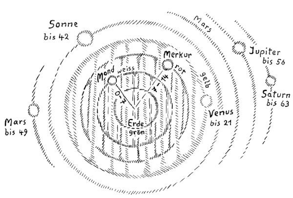 On the other hand, we are in Mercury with the earth. What Mercury experiences are only becomes visible to us through the eye, which we can acquire if we consciously penetrate back, contemplatively penetrate back into the earth experiences between the 7th and 14th year. And when one then becomes sexually mature, lives through the age from 14 to 21, then one lives into the Venus sphere (yellow). The ancients were not so stupid; they knew a lot about these things in their dreamlike knowledge, and they gave the planet into which one lives when one becomes sexually mature a name that is connected with the love life, because that begins at this time.