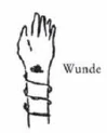 Wunden müssen in Ruhe gehalten werden; auch nicht zu viel mit Wasser berühren! Wenn sie schmutzig werden, so sollen sie zuerst mit einem anti- oder aseptischen Mitteln gereinigt werden (Hände zuerst fünf Minuten aseptisch waschen, Instrumente und so weiter auskochen!). Ist die Wunde nicht schmutzig, dann sol] man sie ganz in Ruhe lassen. Um die Wunde herum kann man gut reinigen. Alle antiseptischen Mittel und so weiter halten sehr die Heilkraft zurück. Die hauptsächlichen Heilkräfte kommen doch aus dem Organismus selbst. 4. Wenn kein Verbandszeug zum Abbinden vorhanden ist, soll man die Arterie über der Wunde (Puls-, Oberarm-, Halsarterie) steif zuhalten, vielleicht 10 bis 15 Minuten.