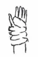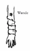 5. Bei gebrochenem Handgelenk nehme man ziemlich breiten, starken Verband. Die Hand gut ausstrecken. Beim Winden mit der Hand anfangen. Die erste Windung über den Daumen schief wickeln, dann die Hand ohne Daumen. Beim Höherhinaufkommen jedes Mal den Verband umschlagen. Den Ellbogen freilassen und noch etwas über den Ellbogen hinaus verbinden[; mit Sicherheitsnadeln abschließen]. Im Notfalle kann es mit jedem Tuch gemacht werden.