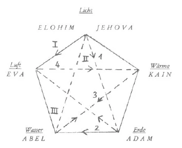 Im Beginne des Erdenwerdens stieg aus geistigen Höhen einer der Licht geister oder Elohim herab und verband sich mit Eva, der Erdenmutter. Aus dieser Verbindung erstand Kain, der erste Erdenmensch, wesentlich so lebend, daß sein Atem im Aufneh men und Abgeben von Wärmesubstanz bestand.
