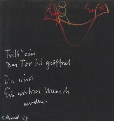 If man has recognized this through the sight of his head from beyond the threshold, how wanting goes through the head [the verb “wanting” in the second line of the mantra is underlined] and how the senses represent will [the word “will” in the third line of the mantra is underlined], then he will be further instructed on how the heart harbors the soul and how one can feel the soul in the heart, just as one can will the mind of the head in relation to the head. And then one knows, when one regards thinking not as a property of the head, but as a property of the heart, the soul of the heart, how thinking belongs not to the individual human being, but to the world; then one experiences the life of the world, which circles there as world music. [The second verse is written on the board:]