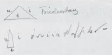 Nach einer kleinen Pause nahm er seinen Bleistift wieder zur Hand und sagte ungefähr das Folgende: «Es ist nicht nur möglich, mit den Armen und Händen die Ihnen nun ja schon bekannten Laute zu bilden, auch in Raumbewegungen müssen Sie sie empfinden lernen. Und da ist eine gerade, in irgendeine Richtung strebende Linie ebenso wie ein i, wie ein «Strecken», eine zweite im Winkel dazu sich bewegende Linie wie ein e - verlängern Sie nur einmal beide Linien über den Winkel heraus, da sehen Sie es ja mit Augen. Und die dritte Linie, die das gleichseitige Dreieck beschließt, indem sie zum Ausgangspunkt zurückkehrt, ist wie ein u zu empfinden. Jede Rückwärtsbewegung ist so etwas wie ein Sich-nach-oben-Wenden. Und so sollten Sie dieses gleichseitige Dreieck i e u wie urbildlich in sich tragen.»