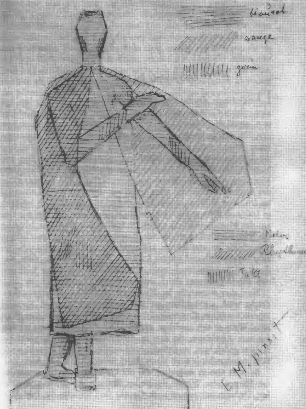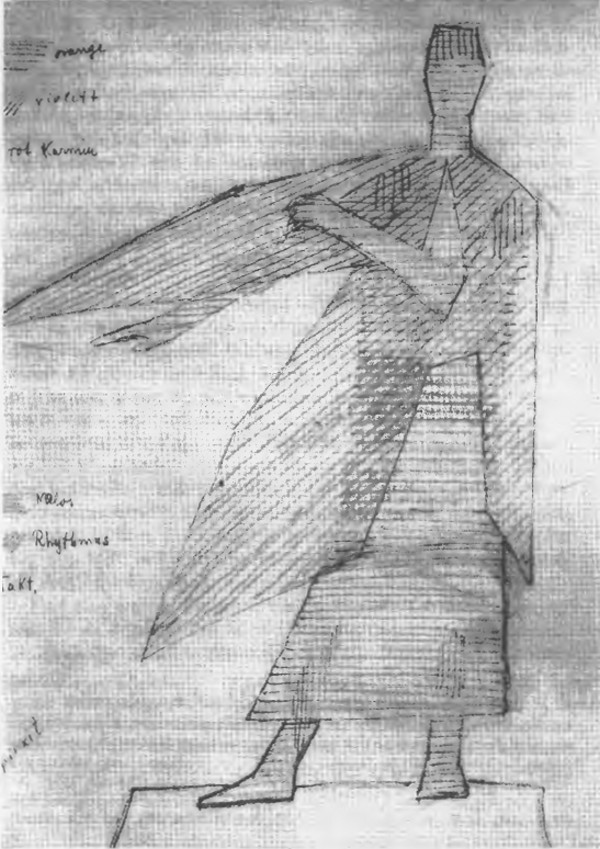 In 1921 the sculptress Edith Maryon endeavoured to make models of the eurythmy gestures. However, it was found that eurythmy could not be suitably represented in this medium, and Steiner then designed the wooden eurythmy figures that have since become well known. He gave indications regarding the production and colouring of these figures, some of which remain extant in the original and some in copies by Edith Maryon. The complete set was published as Skizzen zu den Eurythmiefiguren [Dornach 1957] (‘Sketches for the eurythmy figures’). The two following examples (the only ones for music) for the major and minor chords are reduced in size by about one third. The figures have been redrawn and newly coloured by Annemarie Bäschlin, and are published as Die Eurythmie-Figuren von Rudolf Steiner [Dornach 1989] (Rudolf Steiner's eurythmy figures’).