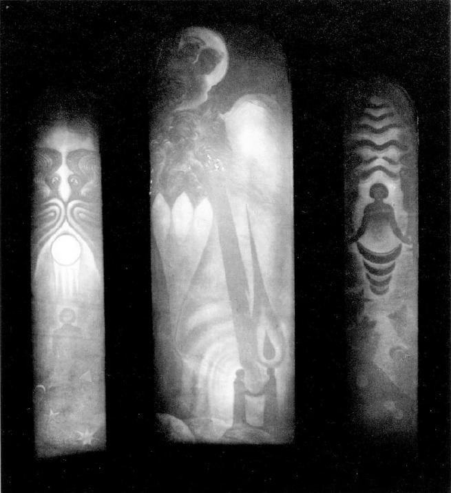 [ 28 ] You can see it from the windows that close the building down here (Figs. 109-113). These windows are designed in such a way that they are made of single-colored glass panes using a method that could be called glass engraving: the shape is scratched out of a single-colored glass pane with a diamond pencil. This glass pane, when it is finished, is of course not yet a work of art when it is placed somewhere, just as a musical score is not a work of art. Only when it is in its proper place and the light of the sun shines through it, then the work of art is there. Only in connection with the external nature, with the external world, does it make sense.