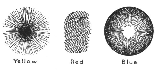We saw that yellow wants, of its own nature, to get paler and paler towards the edges; it wants to radiate; blue wants to heap itself up, to intensify itself, and red wants to be evenly distributed without outline. It wants to hold the middle place between radiating and concentrating; that is red's nature. So you see there is a fundamental difference between colours that are in themselves quiet or mobile, quiet as green, or mobile as mauve, or isolated like black and white. If we want to bring these colours together, it must be as pictures. And red, yellow and blue, in accordance with their inner activity, their inner mobility, are distinguished from the inner mobility of lilac. Lilac tends to dissolve—that is not an inner mobility—it tends to evaporate; red is quiet—it is movement come to rest—but, when we look at it, we cannot rest at one point: we want to have it as an even surface, which, however, is unlimited. With yellow and blue we saw the tendency to vary. Red, yellow and blue differ from black, white, green and peach-colour. You see it from this: Red, yellow and blue have, in contrast to those other colours which have pictorial qualities, another character and if you consider what I have said about them you will find the term I apply to this different character justified. I have called the colours black, white, green and peach-colour pictures—“pictorial colours” (Bildfarben,) I call the colours yellow, red and blue “lusters”—luster colours. (Blanz-farben,) in yellow, red and blue, objects glisten: they show their surfaces outwards, they shine or glisten.