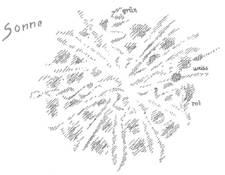 What arises within this Saturnine warmth arises because the penetration of the second Hierarchy signifies an inward being transilluminated. This inner illumination is connected with a condensation of warmth. The mere heat element becomes air. And on the one hand we have the second hierarchy penetrating into the revelation of light. But you must now clearly imagine that in reality entities are penetrating. For a being with the corresponding ability to perceive, light penetrates. Light is that which marks the paths of these beings. If light penetrates somewhere, then under certain conditions shadow, darkness, dark shadow arises. Through the penetration of the second hierarchy in the form of light, shadow also arose. What was this shadow? The air. And indeed, until the 15th and 16th centuries, people knew what air was. Today we only know that air consists of oxygen, nitrogen and so on, which is not much different from saying that a watch consists of glass and silver, which says nothing at all about the watch. Nothing at all is said about the air as a cosmic phenomenon when one says that it consists of oxygen and nitrogen, but much is said about the air when one knows that from the cosmos the air is the shadow of light. - So that now, with the penetration of the second hierarchy into the Saturnian warmth, we actually have the penetration of light (white rays) and the shadow of light, the air (green serpentine lines). And where this arises, there is sun. This is how we should actually have spoken in the 13th, 12th century.