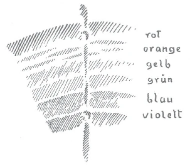 Through this the following came about, through this it came about that, let us say, an Archai or Angeloi being came in here (see drawing 5.17, point on the ray of light on the right) and encountered an element of light, I would like to say, a place of light. In this place of light it received the urge, the desire for darkness through its receptivity to this light. The Angeloi being carried the light into the darkness, or an Angeloi being carried the darkness into the light. These beings become the mediators, the messengers between light and darkness. And the consequence of this was that that which formerly shone only in the light and drew its shadow, the dark airy darkness, after it, began to shimmer in all colors, that light appeared in darkness, darkness in light. It is the third hierarchy that conjured color out of light and darkness.