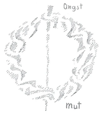 Nun stellen Sie sich vor, daß nicht bloß der Regenbogen da ist, sondern wenn ich jetzt hier einen Schnitt zeichne (siehe Zeichnung, oben) und der Regenbogen so steht (um 90° gedreht), so kommen die Wesenheiten da heraus, da verschwinden sie; hier Angst, hier Mut (siehe Zeichnung S. 22). Der Mut verschwindet wiederum. So wäre jetzt das Auge gerichtet, hier ist der Regenbogen, hier ist jetzt das Rot, Gelb und so weiter. Da bekommt der Regenbogen eine Dicke. Und da werden Sie sich schon vorstellen können, daß wäßriges Element daraus entsteht. Und in diesem wäßrigen Element leben nun geistige Wesenheiten, die wirklich auch eine Art von Abbild sind der Wesenheiten der dritten Hierarchie.