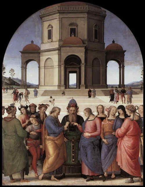 Now we move on to the classical period itself. I ask you to look at this painting by Perugino, Raphael's teacher, and see how Raphael's art really grew out of that of his predecessors. In Perugino's work in particular, we see, once again, I would say, the emergence of a new element: a deep religiosity that now attempts to find its way into the composition and is combined with a certain architectural imagination, on which Raphael's greatness is often based.