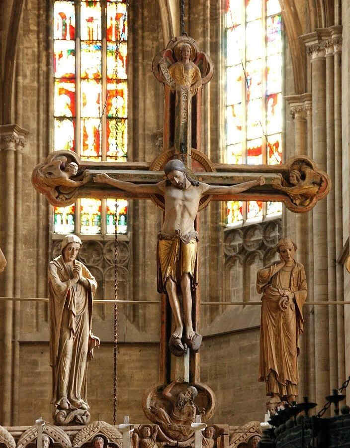 Look at this Crucifixion Group. I will only say one thing to characterise what is most important. In this group you can see how deeply the story of the Passion had found its way into their lives by that time. There is Mary, there is St. John, and in the center the Christ, looking down towards her. If you could see the face you would see an infinite deepening of soul in the expression, an overwhelming depth. In Mary, if you have a feeling for these things, you will recognise at once the flowing together of the more Roman, priestly conception with the Mid-European depth and tenderness of feeling. Here it is recognisable in a most wonderful way. We shall presently show the face of Mary in detail.