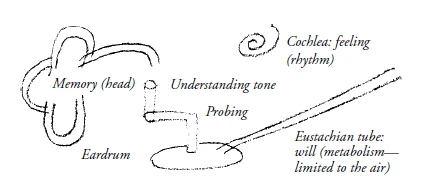 The cochlea, which is filled with fluid, is a higher, metamorphosed intestine of the ear; the feeling of sound lives in it. The Eustachian tube is where what one carries within oneself in terms of language comprehension, what comes to understanding as will, is at work. In the three arches, the three semicircular canals, the sound is essentially retained; this is the memory for sound. Every sense is actually a whole human being.]
