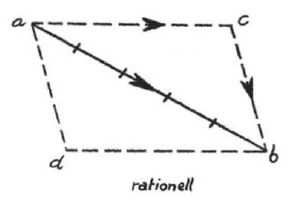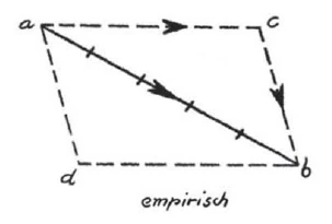 Sie können zu Bewegungen in der Vorstellung kommen, aber nicht zu Kräften. Die müssen Sie in der Außenwelt messen. Und Sie können überhaupt nur konstatieren, dass das \(a\) nach \(b\) gezogen wird nach den Gesetzen des Kräfte-Parallelogramms, wenn zwei Züge ausgeübt werden, von a nach \(c\) und von \(a\) nach \(d\), wenn Sie es äußerlich experimentell feststellen. Es gibt gar keinen Vorstellungsbeweis wie oben. Das muss äußerlich gemessen werden.