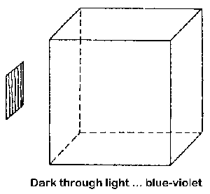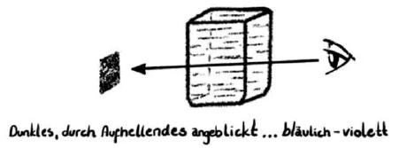 Umgekehrt, wenn Sie hier, ich will sagen, einfach eine schwarze Fläche haben, Sie schauen sie direkt an, dann sehen Sie eben die schwarze Fläche. Nehmen Sie aber an, ich habe hier einen Wassertrog, durch diesen Wassertrog jage ich Helligkeit durch, sodass er aufgehellt ist. Also, ich habe hier eine erhellte Flüssigkeit. Dann sehe ich das Dunkle dunkel durch Hell, durch Erhelltes. Da erscheint Blau oder Violett, das heißt Blaurot, das heißt der andere Pol der Farbe.