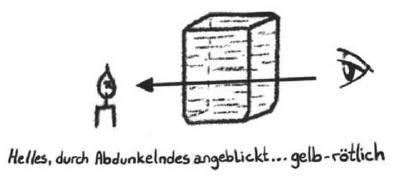 I would first like to present to you what could be called the fundamental phenomenon of color theory. You will gradually find this fundamental phenomenon of color theory to be true and confirmed in the phenomena that you can observe throughout the entire scope of what is known as optics or color theory. Of course, the phenomena become more complicated, and the simple phenomenon does not always reveal itself so conveniently in the external world. But if you take the trouble to look for it, you will find it everywhere. This simple phenomenon, initially expressed in Goethe's manner, is this: if you see something brighter through darkness, then the brightness appears through the darkness in the sense of the bright [color], in the sense of yellowish or reddish, in other words: For example, if I see some kind of luminous, so-called whitish light through a sufficiently thick plate that is somehow tinted, then what I would otherwise see as whitish when looking at it directly appears yellowish, yellow-reddish to me. Light through darkness appears yellow or yellowish-reddish. That is one pole: light through darkness appears yellow or yellowish-red.