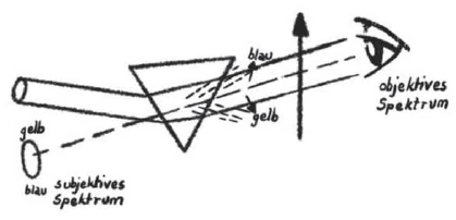Das Erstere kann man, wenn man gelehrt sein will, die objektiven Farben nennen, das am Schirm. Das andere, was man sieht, wenn man durch das Prisma schaut, kann man nennen das subjektive Spektrum. Das subjektive Spektrum erscheint in Umkehrung des objektiven Spektrums. Wenn wir so sprechen, dann haben wir ganz gelehrt gesprochen.