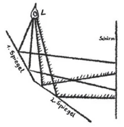 Diese Fresnel’schen Versuche sind außerordentlich interessant. Aber man muss sich einmal klar werden, was da eigentlich geschieht in der Anordnung, die Fresnel seinen Versuchen gegeben hat. Aber ich bitte Sie, jetzt wirklich auf die Tatsachen recht sehr achtzugeben, denn es handelt sich darum, dass wir wirklich ganz genau ein Phänomen studieren. - Sehen Sie, nehmen Sie an, ich hätte zwei Spiegel und habe hier eine Lichtquelle, das heißt, mit einer Flamme leuchte ich von da aus, sodass ich, wenn ich hier einen Schirm aufstelle, Bilder bekomme durch diesen [ersten] Spiegel und Bilder bekomme von dem anderen [zweiten] Spiegel. Nehmen Sie also an - ich werde das zeichnen im Durchschnitt - zwei sehr wenig gegeneinander geneigte Spiegel. Hier habe ich eine Lichtquelle-ich will sie Z nennen - [und] einen Schirm, so spiegelt sich mir das Licht, indem es hier [auf den ersten Spiegel] auffällt, sodass ich in der Lage sein kann, hier durch das reflektierte Licht den Schirm zu beleuchten. Ich werde - wenn ich das Licht hier [auf den ersten Spiegel] auffallen lasse, so kann ich durch den Spiegel den Schirm hier beleuchten, sodass er hier in der Mitte heller ist als in der Umgebung. Nun habe ich aber hier einen zweiten Spiegel, durch den wird das Licht etwas anders reflektiert, und es wird gewissermaßen noch ein Teil desjenigen, was von hier unten [gespiegelt wird], von meinem Lichtkegel, nach dem [unteren oder zweiten] Spiegel [zum Schirm] hin dirigiert wird - das fällt noch hinein in das Obere [des durch den ersten Spiegel Gespiegelte], sodass durch die Neigung wird gewissermaßen, was der obere Spiegel spiegelt, wird als Helligkeit auf den Schirm geworfen; was vom unteren Spiegel gespiegelt wird, wird auch als Helligkeit darauf geworfen. Man kann sagen, dass cs für diesen Schirm so ist, wie wenn er von zwei Orten aus erhellt würde.