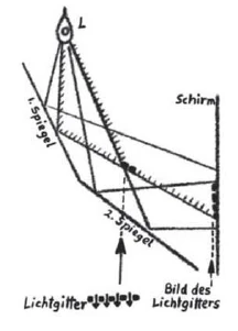 That is what I asked you to think about carefully. Because you have to follow how a grid is created. You have alternating brightness and darkness because light rushes into light. When light rushes into light, the light is canceled out and turned into darkness. We must therefore explain the formation of such a grid of light by the arrangement we have made with these mirrors. You will always get this phenomenon if you have a light source here whose speed of light is not taken into account. With regard to the speed of light, the differences in the speed of light that occur here are of no great significance. What I want to show here is this: what occurs within the light itself with the aid of the apparatus is that the grid is reflected: light, dark, light, dark.