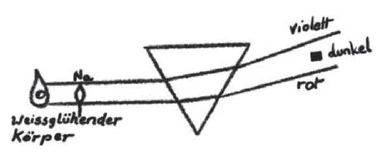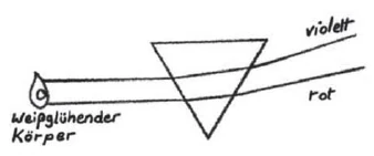 Weipglühender Körper Nun habe ich Ihnen gesagt: Wenn das eine Licht durch das andere durchgeht, mit ihm überhaupt in irgendeine Beziehung tritt, dann wirkt unter Umständen das eine Licht trübend auf das andere Licht, auslöschend auf das andere Licht, wie das Prisma selber trübend wirkt. Das stellt sich ganz besonders dadurch heraus, dass man - wir werden den Versuch wirklich machen -, dass man den folgenden Versuch macht. Sehen Sie, ich will das, um was es sich dabei handelt, aufzeichnen: Nehmen wir an, wir haben dasjenige, was ich Ihnen gestern zeigte, wir haben wirklich ein solches Spektrum, und zwar direkt durch die Sonne erzeugt; wir haben ein solches Spektrum bekommen vom Violett bis zum Rot. Wir könnten ein solches Spektrum auch erzeugen, indem wir nicht die Sonne durch einen solchen [kreisförmigen] Spalt durchscheinen ließen, sondern dadurch, dass wir an diese Stelle hier einen festen Körper herbrächten, den wir glühend machten. Dann würden wir auch allmählich, wenn er bis zur Weißglut kommt, die Möglichkeit haben, ein solches Spektrum zu haben. Es ist gleichgültig, ob ein Sonnenspektrum [vorliegt] oder ob das Spektrum von einem weiß glühenden Körper kommt.