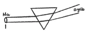 Now we can also produce a spectrum in a slightly modified way. Let's assume we have a prism here and a sodium flame, i.e., a volatile metal: sodium. Gas becomes sodium. The gas burns, evaporates, and we generate a spectrum from this evaporating sodium. This produces something very peculiar. If we generate the spectrum not from the sun or from a solid glowing body, but from a glowing gas, then a single point in the spectrum is very strongly developed, and sodium light takes on a particularly yellow color. Here we have red, orange, and yellow. The yellow part is particularly strong in sodium. The rest of the spectrum is reduced in sodium metal, almost non-existent. So everything from violet to yellow and from yellow to red is reduced. This gives us what appears to be a very narrow yellow stripe, or a yellow line. This is because it is part of the entire spectrum. The rest of the spectrum is simply diminished. In this way, you can find spectra from a wide variety of substances that are not actually spectra, but only glowing lines. From this you can see that, conversely, if you don't know what is actually in a flame and you produce such a spectrum, then if you get a yellow spectrum, there must be sodium in the flame. You can tell which metal you are dealing with.