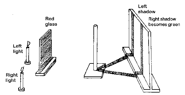 Ich will nun das eine [linke] der Lichter färben, das heißt, ich will es gehen lassen durch eine farbige Glasplatte, sodass das eine der Lichter gefärbt wird. Wir wissen, was da geschieht: Es wird das eine der Lichter abgedunkelt. So! Aber jetzt sehen Sie, dass durch dieses Abdunkeln der Schatten [rechts], welcher durch den Stab bewirkt wird von meiner linken Lichtquelle aus, deren Licht ich gerade abdunkle und rötlich mache, dass dieser [rechte] Schatten grün wird. Er wird so grün, wie grün wird - wenn Sie zum Beispiel scharf an eine kleine rote Fläche hinschauen, dann von dieser roten Fläche das Auge abwenden und dann einfach in gerader Richtung nach einer weißen Fläche lenken -, so sehen Sie [wie grün wird] dasjenige, was Sie früher rot gesehen haben, ohne dass etwas da ist, sondern gleichsam [tritt] die grüne Farbe [von] selber auf die Fläche hin. Wie Sie da [beim Nachbild] sehen die grüne Fläche als ein zeitliches Nachbild der roten Fläche, die Sie früher wirklich gesehen haben, indem Sie das Auge dem Rot exponiert haben, - so sehen Sie hier [beim farbigen Schatten], indem ich die [linke] Lichtquelle rot abdunkle, ihren [rechten] Schatten [grün]. Also, was früher [vor der Einfügung der farbigen Glasplatte] bloße Dunkelheit war, sehen Sie jetzt grün. Wenn ich dieselbe Lichtquelle grün abdunkeln werde, beobachten Sie dann, was dann entsteht! Sie sehen, der Schatten entsteht dann rot. Wenn ich dieselbe Lichtquelle blau abdunkle, so sehen Sie, der Schatten entsteht dann gelblich [-orange]; würde ich die Lichtquelle violett abdunkeln, so gäbe es Orange [-Gelb].