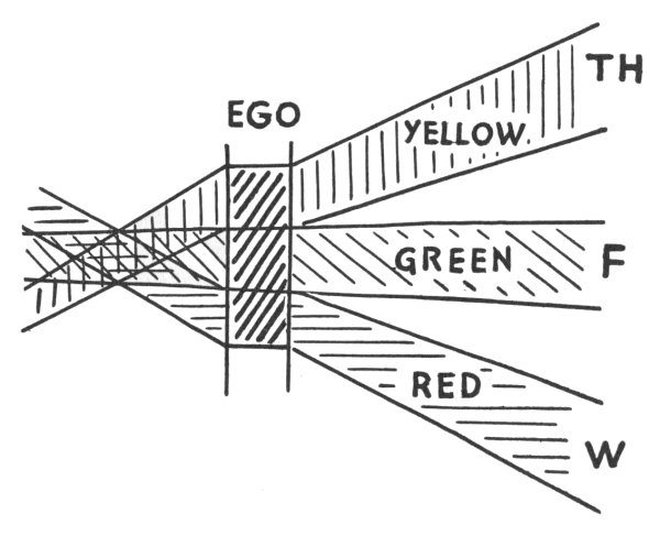 But now we are considering the relation of the ego to the soul-forces that work within it, and their action beyond the threshold of consciousness in the spiritual world. (Drawing, middle and right). An opposite condition may be brought about if the ego has been weakened in any way. Then the threshold is crossed, as it were, in the opposite direction (See drawing, left). Then thinking swerves aside (yellow, left), mingles with feeling (green, left), and willing (red, left), and confusion results. This happens if thinking is exposed in any way to the danger of not being properly confined, so that it asserts itself unwarrantably in the consciousness. Then, because the ego is not working as it should, thinking slides into the sphere of feeling or of will. Instead of working side by side, thinking mixes itself with feeling, or will, the ego being for some reason unable to exert its normal power.