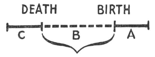 Why should this be? Consider the fact that thinking slips down into the sphere of feeling. Now as soon as a man lives with his soul in the sphere of feeling, he is no longer in the life that is bounded by birth and death or by conception and death, but lives in the whole world, the extended world. This represents the usual life span (See drawing, a); within the realm of feeling he lives also in the period from his last death to his birth into this present life (See drawing, b); and with his will he lives even in his previous incarnation (Drawing, c).