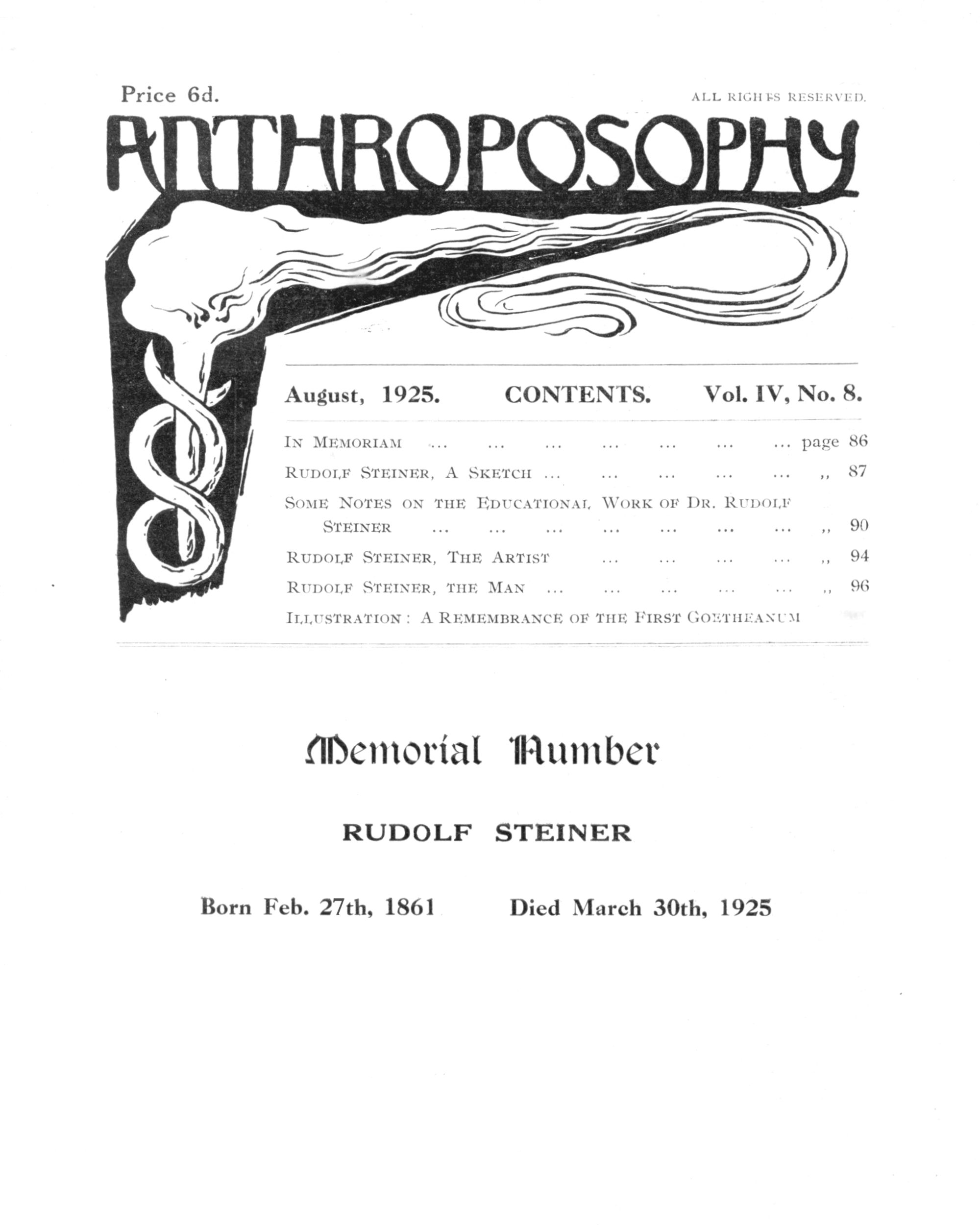 A memorial edition of the journal Anthroposophy with eulogies of Rudolf Steiner. Contributors include D.N. Dunlop, G. Schubert, Millicent Mackenzie and Arild Rosenkrantz